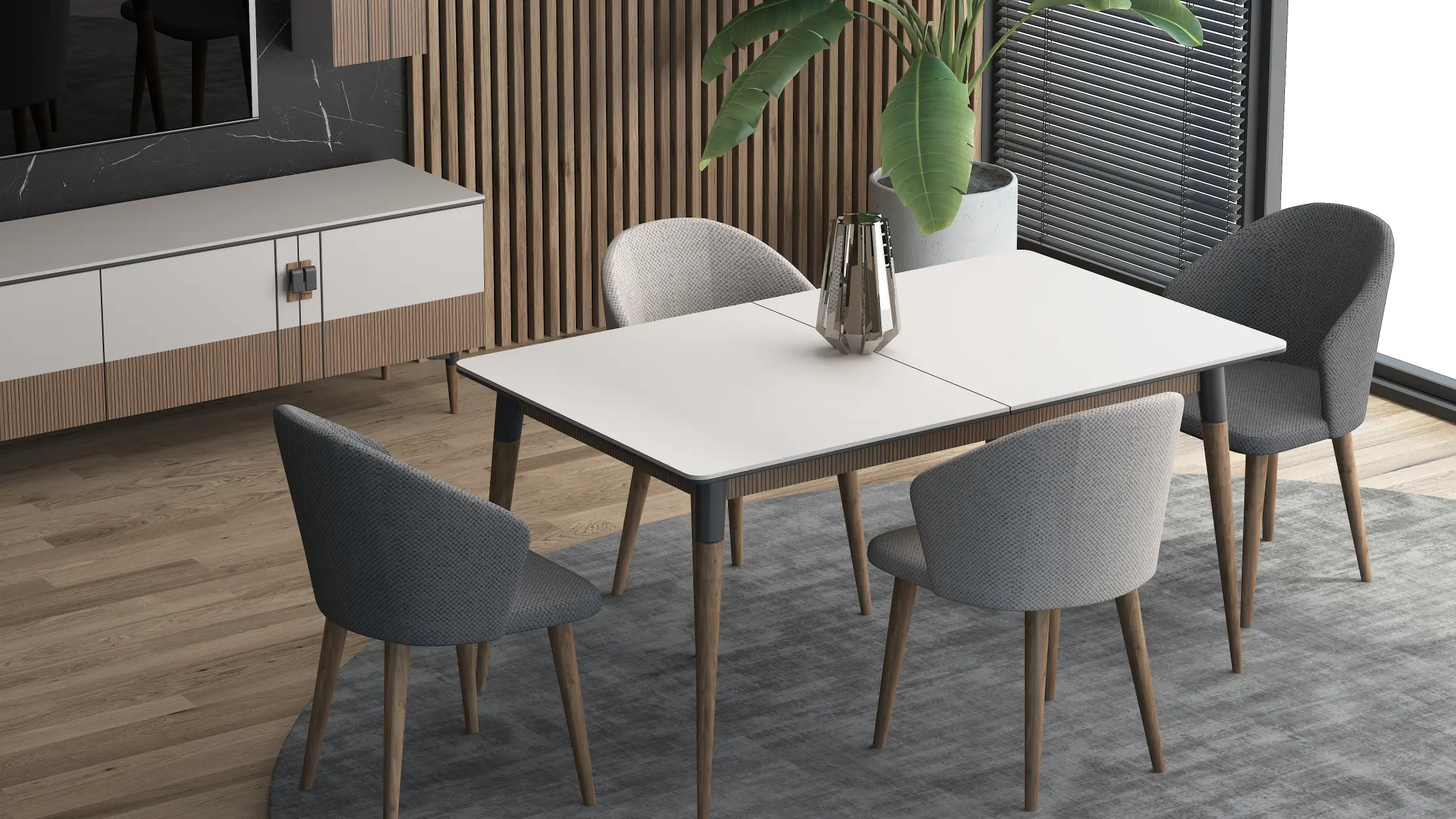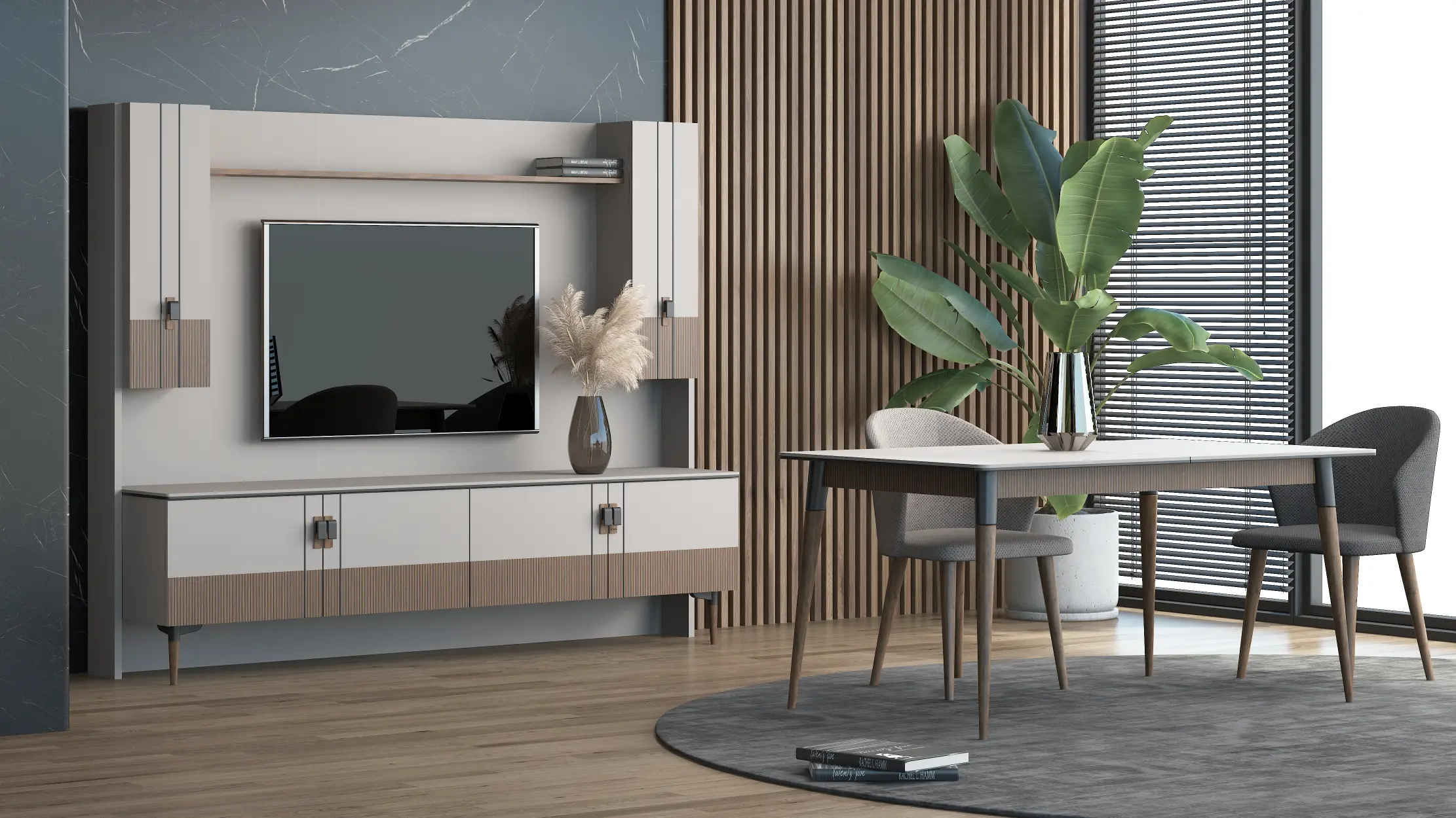 Yemek Odası Modelleri Takım İçeriği | Ürün 1 masa, 4 sandalye, 1 aynalı konsol, 1 TV ünitesinden oluşup her ürün opsiyoneldir |